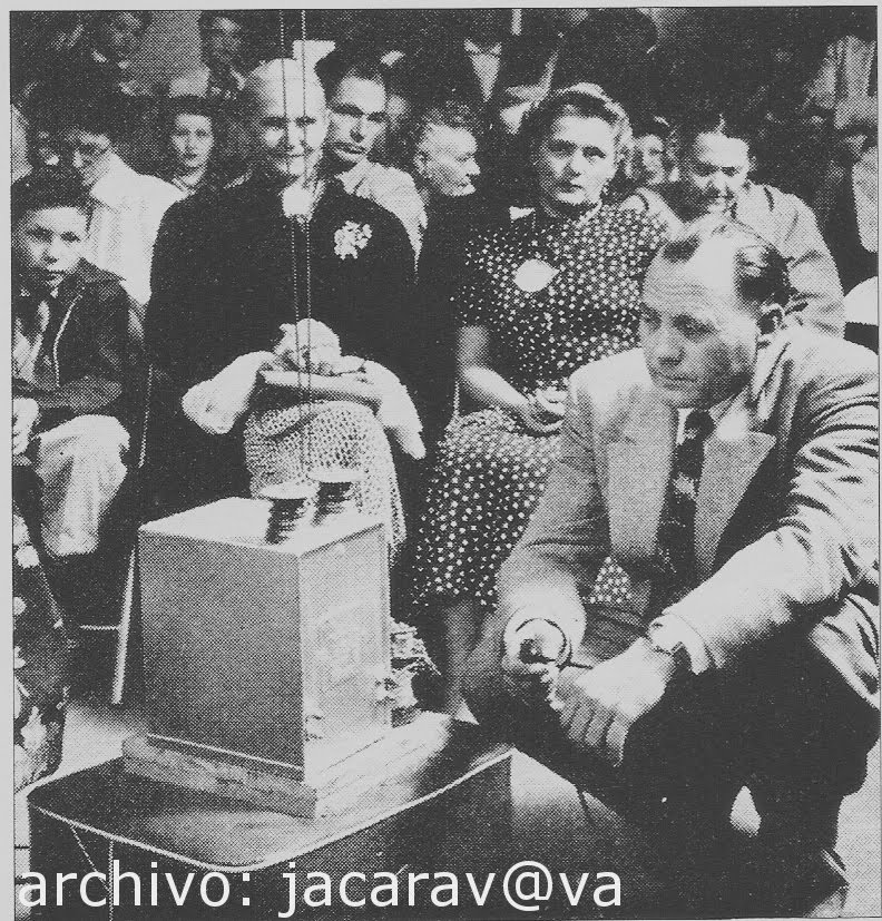 En la década de los cincuenta, en plena vorágine del movimiento contactista, las reuniones y conferencias auspiciadas por célebres contactados se repartían por la geografía californiana y otros lugares de Norteamérica. En la presente fotografía el contactado Daniel Fry utiliza, ante la mirada atónita de los asistentes, una “radio” para emitir mensajes al espacio. Curiosamente el aparato no podía recibir emisión alguna. Era frecuente que para apoyar sus tésis los presuntos embajadores de los extraterrestres se valieran de diferentes "aparatos" técnicos para adornar sus charlas.